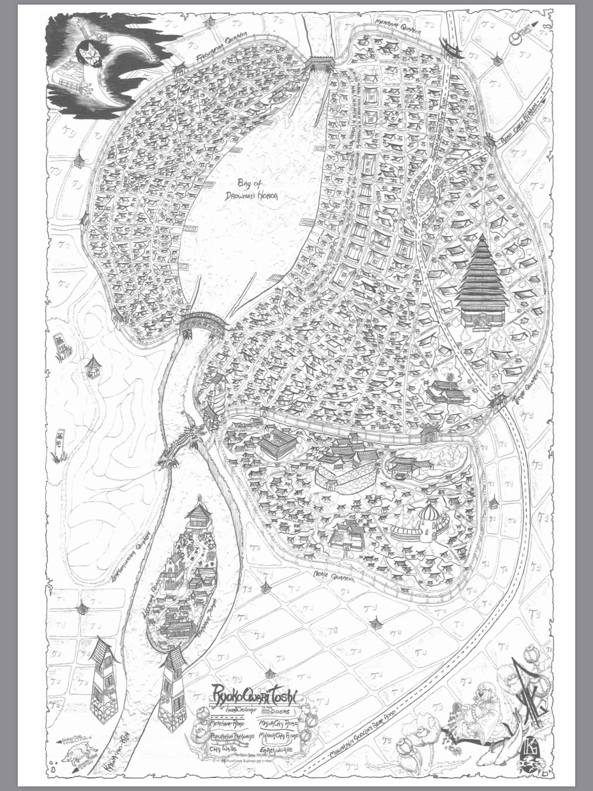 Opening the scrolls, the party finds the Scorpion Shosuro family and the Unicorn Shinjo family have both left polite inquiries for a next-day visit to their estates by the new Emerald Magistrates.